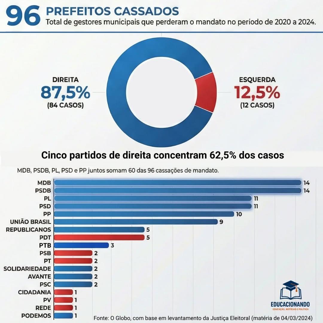 Olhe aí, caro e atento leitor, o placar da corrupção envolvendo os prefeitos e seus partidos. O MDB tem o maior número de gestores cassados, 87,5%. A pesquisa corresponde ao período de 2020 a 2024. Não acredito que houve alguma mudança significativa. O MDB deve continuar como protagonista-mor da corrupção. Logo em seguida o PSDB. Depois as legendas do chamado centrão: PL, PSD, PP, UNIÃO BRASIL E O REPUBLICANOS.