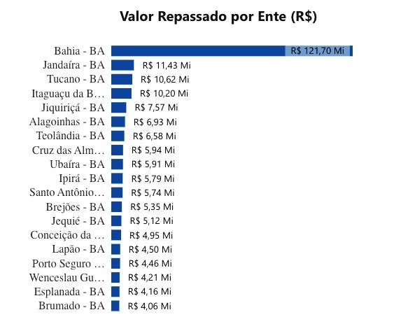 No cenário estadual, a Bahia movimentou R$ 560,1 milhões nessa modalidade de repasse ao longo de 2025. Desse total, R$ 121,7 milhões foram destinados diretamente ao governo do estado, enquanto o restante foi distribuído entre municípios baianos.