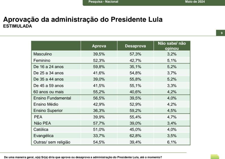 Consideraram a gestão do presidente como péssima nos respectivos citados anteriormente, cerca de 23,7%; 29,8%; 31,5% e 31,3%. Ainda nesses respectivos meses, a aprovação de Lula foi diminuindo, sendo 54,3% em agosto de 2023, 48% em janeiro de 2024, 46,6% em março deste ano e 46,2% em maio.