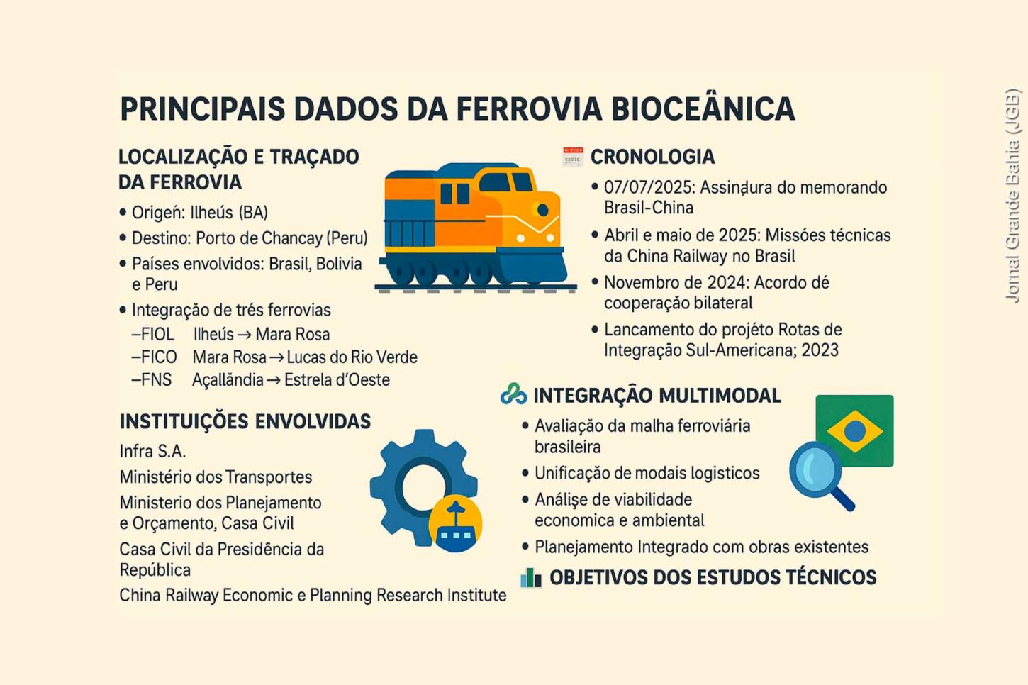 O Brasil e a China oficializaram nesta segunda-feira (07/07/2025), em Brasília, um importante passo rumo à integração logística sul-americana: foi assinado no Ministério dos Transportes o memorando de entendimento que viabiliza os estudos técnicos para a implantação da Ferrovia Bioceânica. O projeto interligará o porto de Ilhéus, na Bahia, ao porto de Chancay, no Peru, criando um corredor ferroviário interoceânico que promete revolucionar o escoamento de cargas entre o Atlântico e o Pacífico.