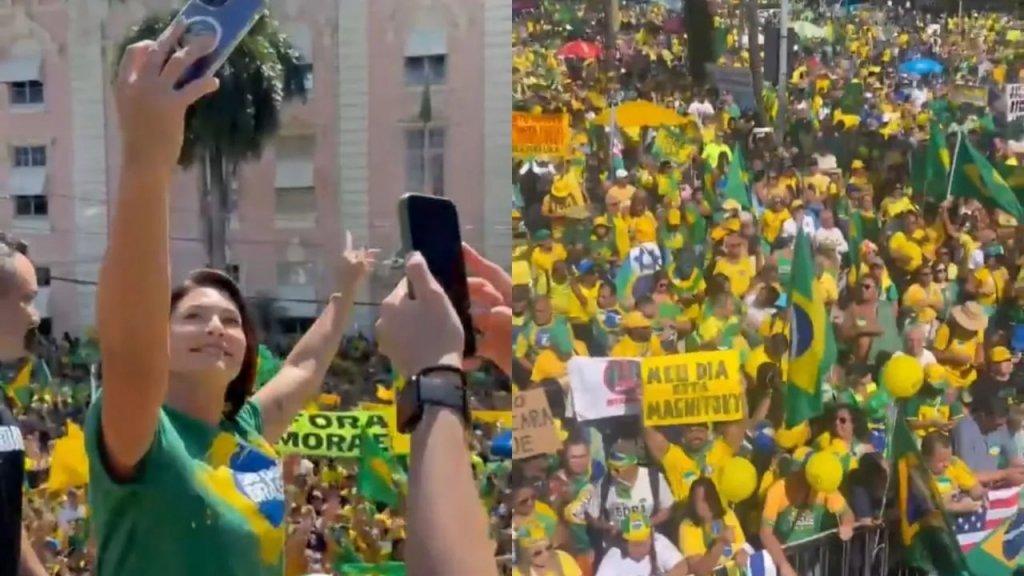 Já em Belém, a ex-primeira-dama Michelle Bolsonaro marcou presença na manifestação realizada no centro da cidade, sendo recebida com aplausos e falas inflamadas de parlamentares locais. Ela não discursou, mas posou para fotos e conversou com manifestantes, em mais um gesto de aproximação com a militância bolsonarista.